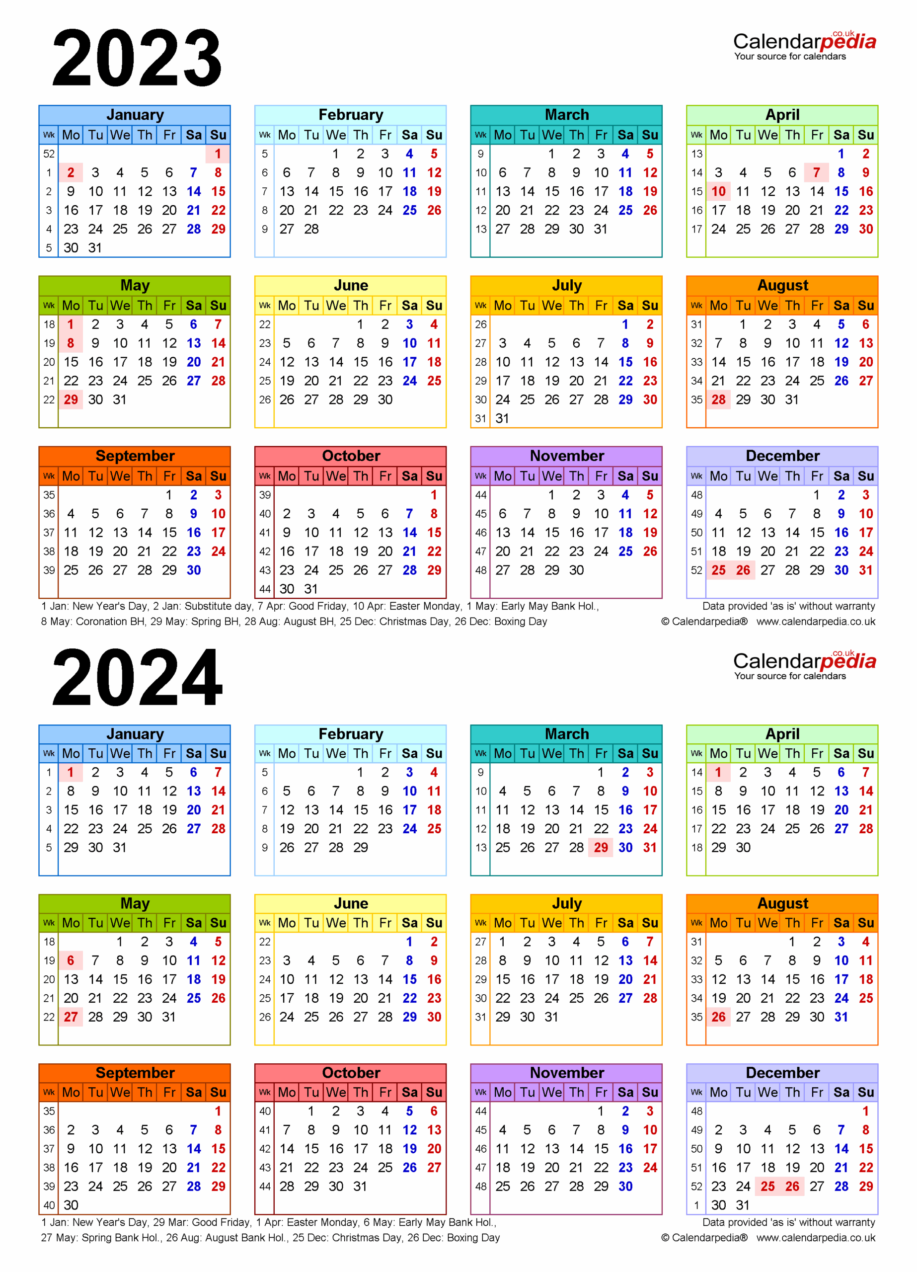 Two Year Calendars For 2023 And 2024 UK For Microsoft Excel