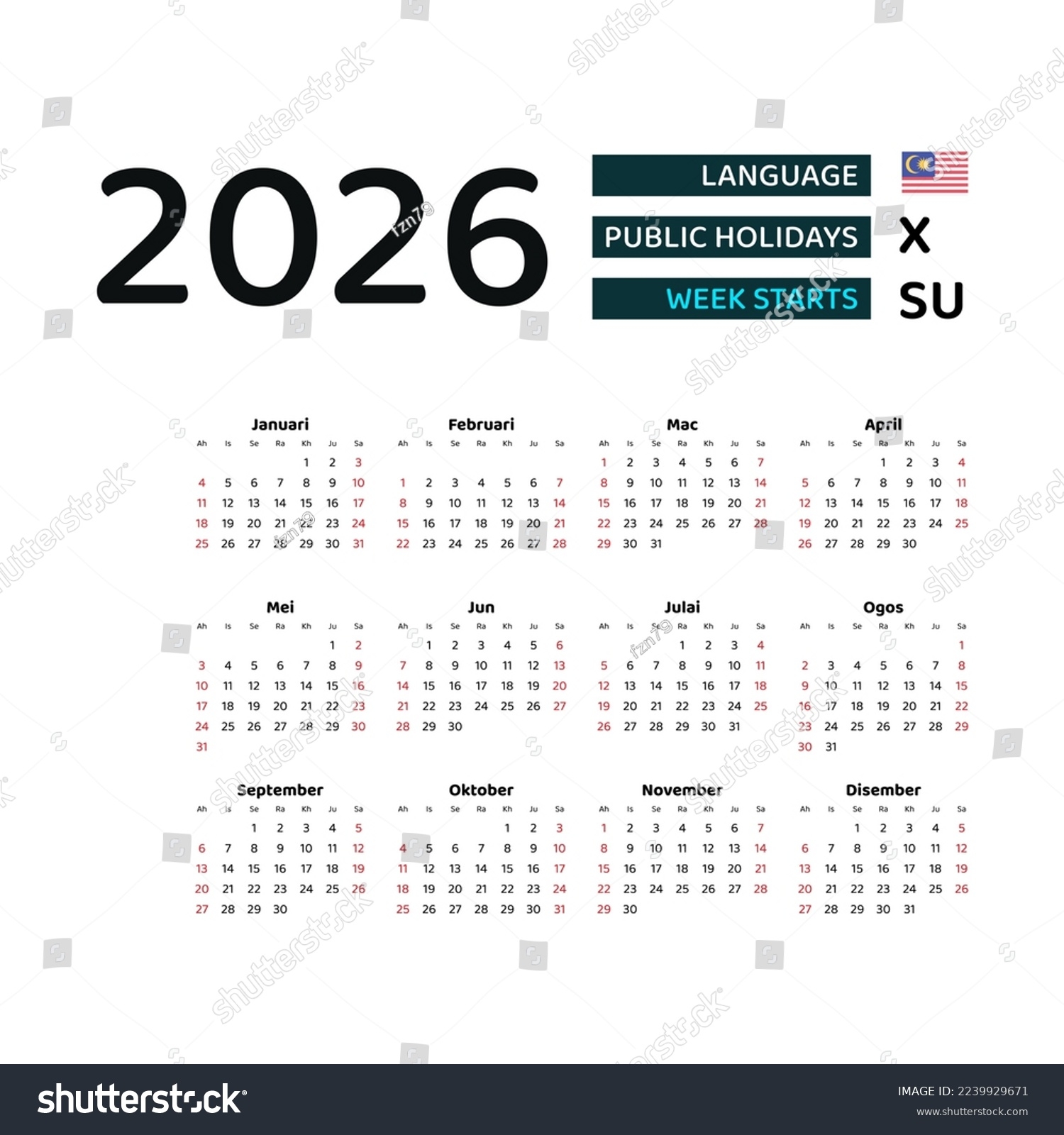 Malaysia Calendar 2026 Week Starts Sunday Stock Vector Royalty