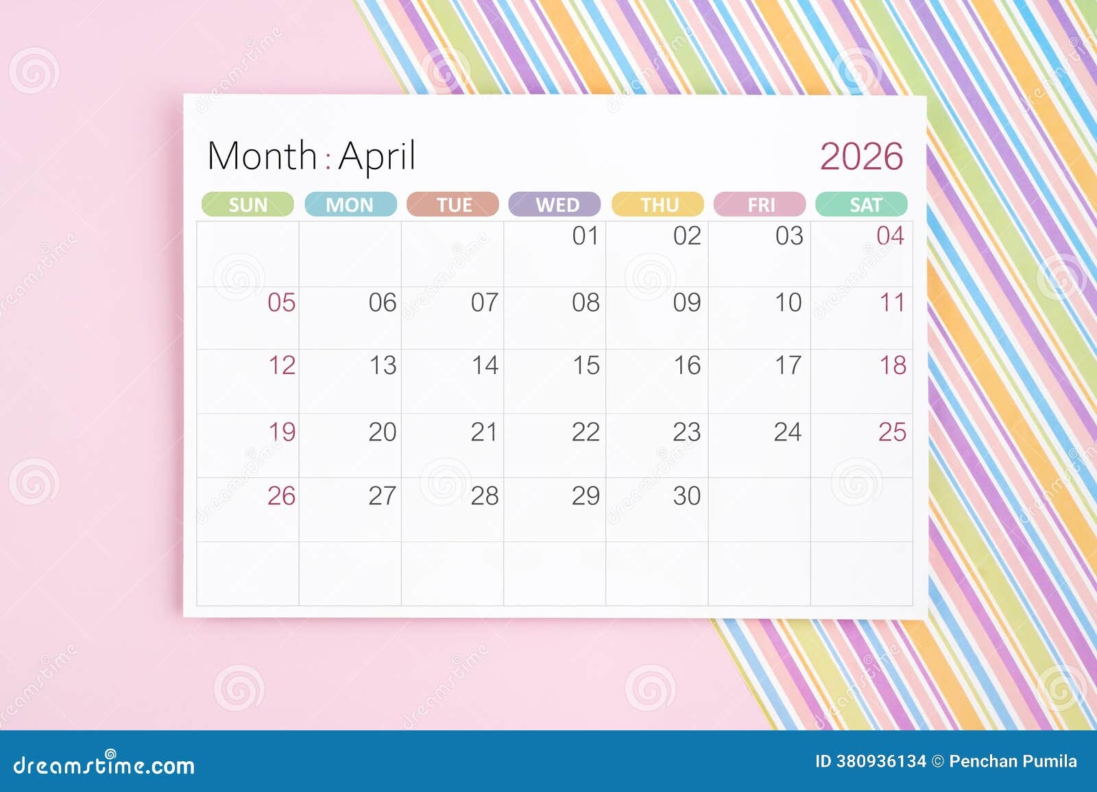 April 2026 Calendar Page On Pink And Rainbow Background Stock