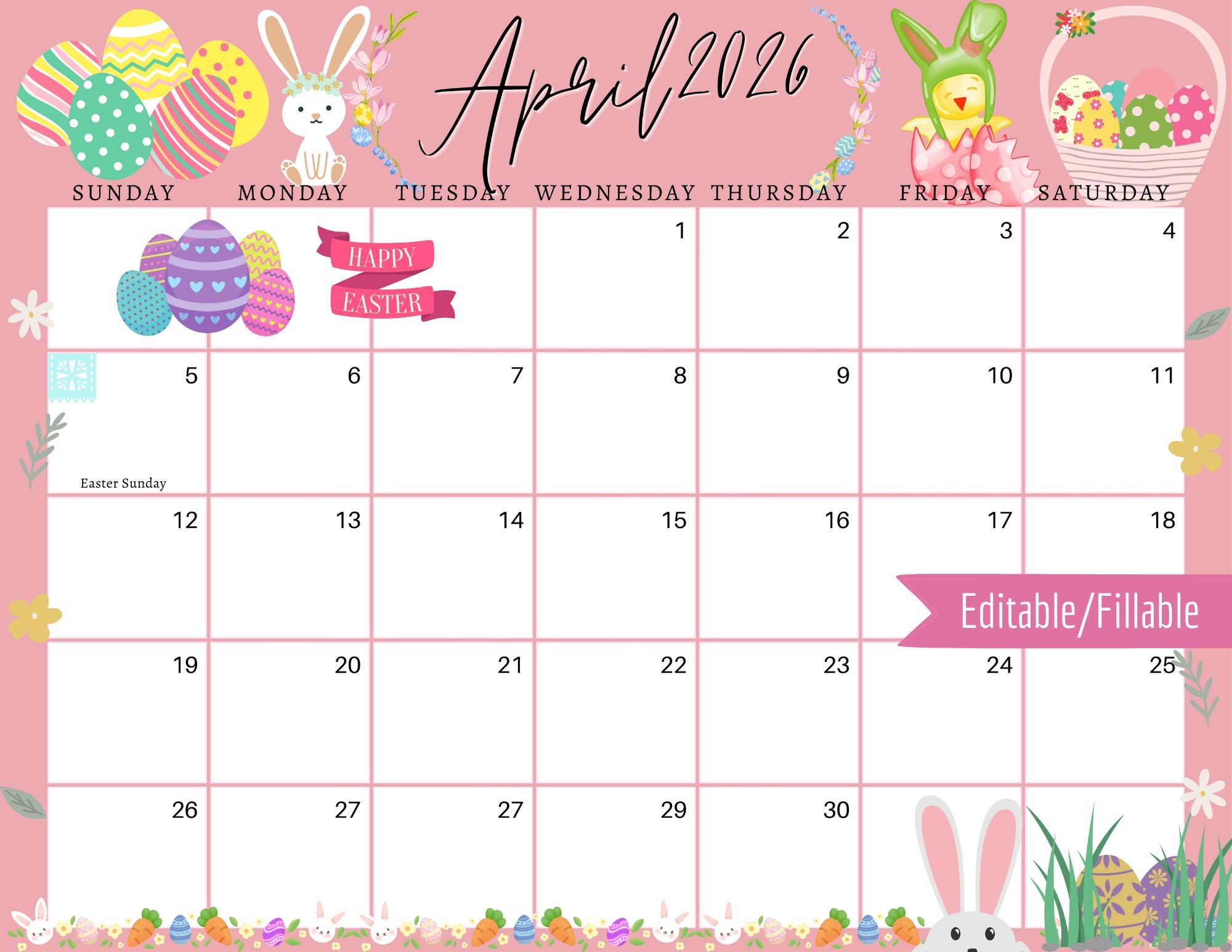 April 2026 Digital Calendar Light Pink Easter Sunday Editable