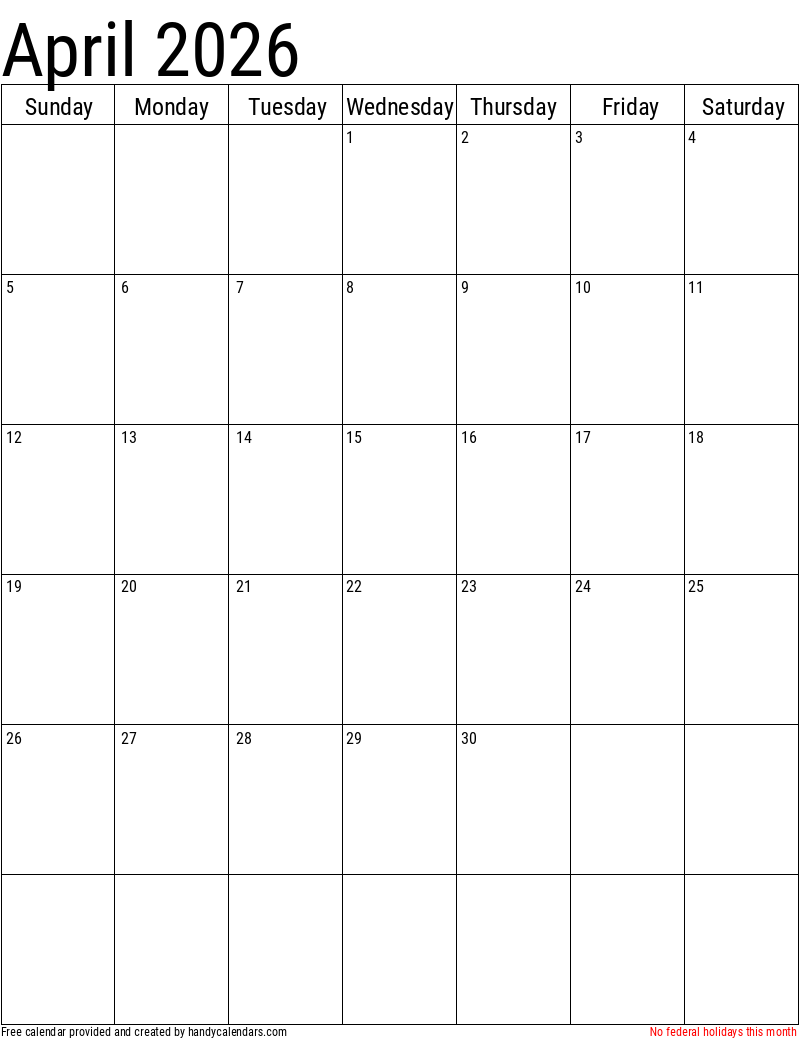 April 2026 Vertical Calendar With Holidays Handy Calendars