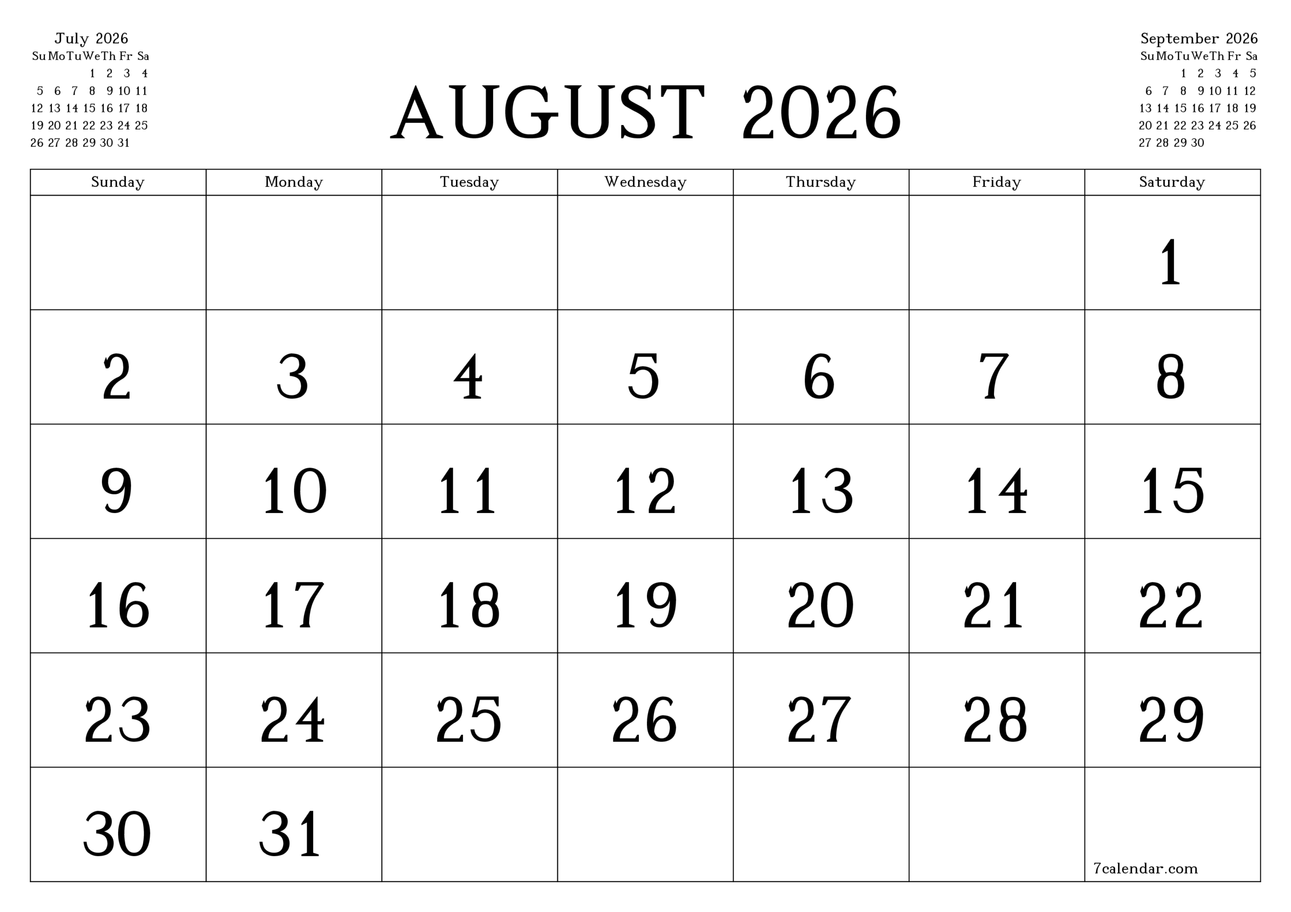 August 2026 Calendar Printable