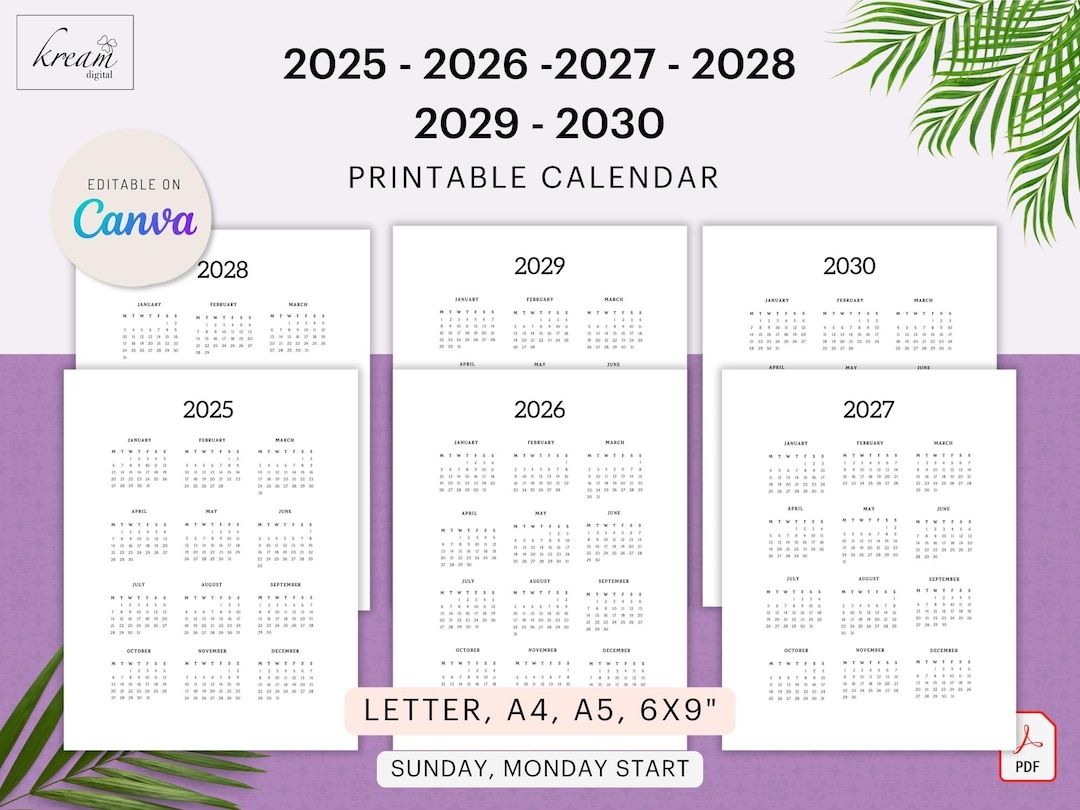 CANVA 2025 2026 2027 2028 2029 2030 Template Sunday And Monday Start Printable PDF Letter A4 A5 6×9
