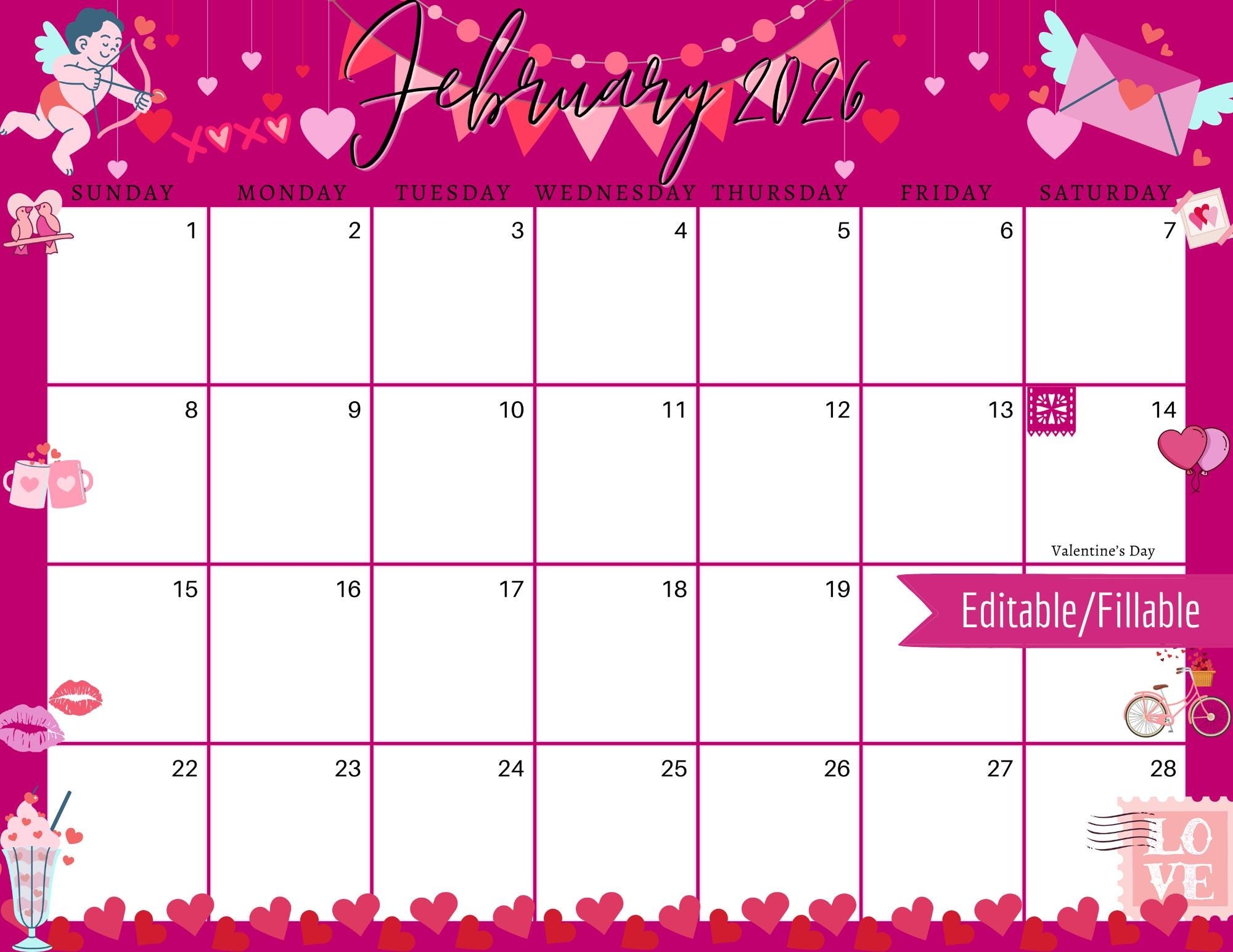 Editable February 2026 Calendar Printable Valentine s Day