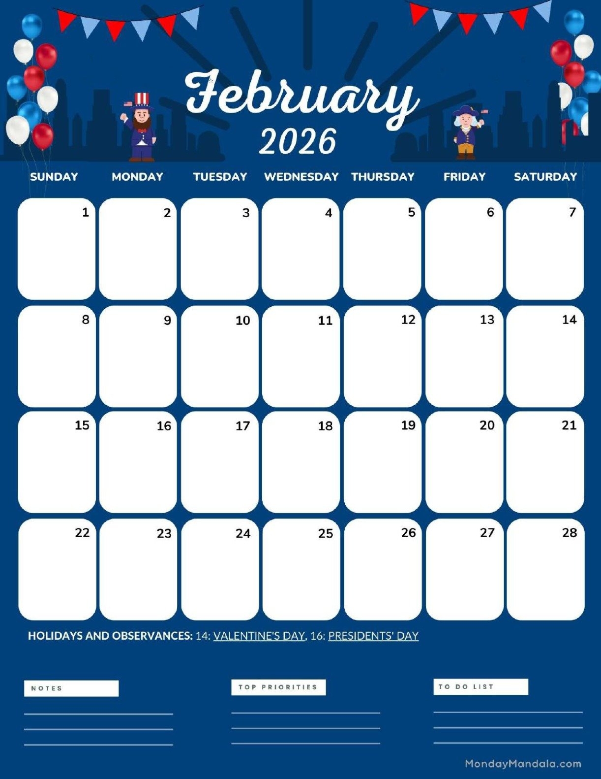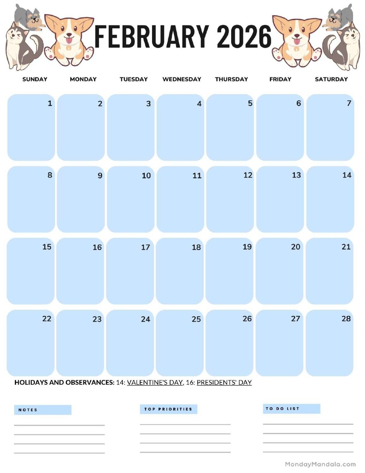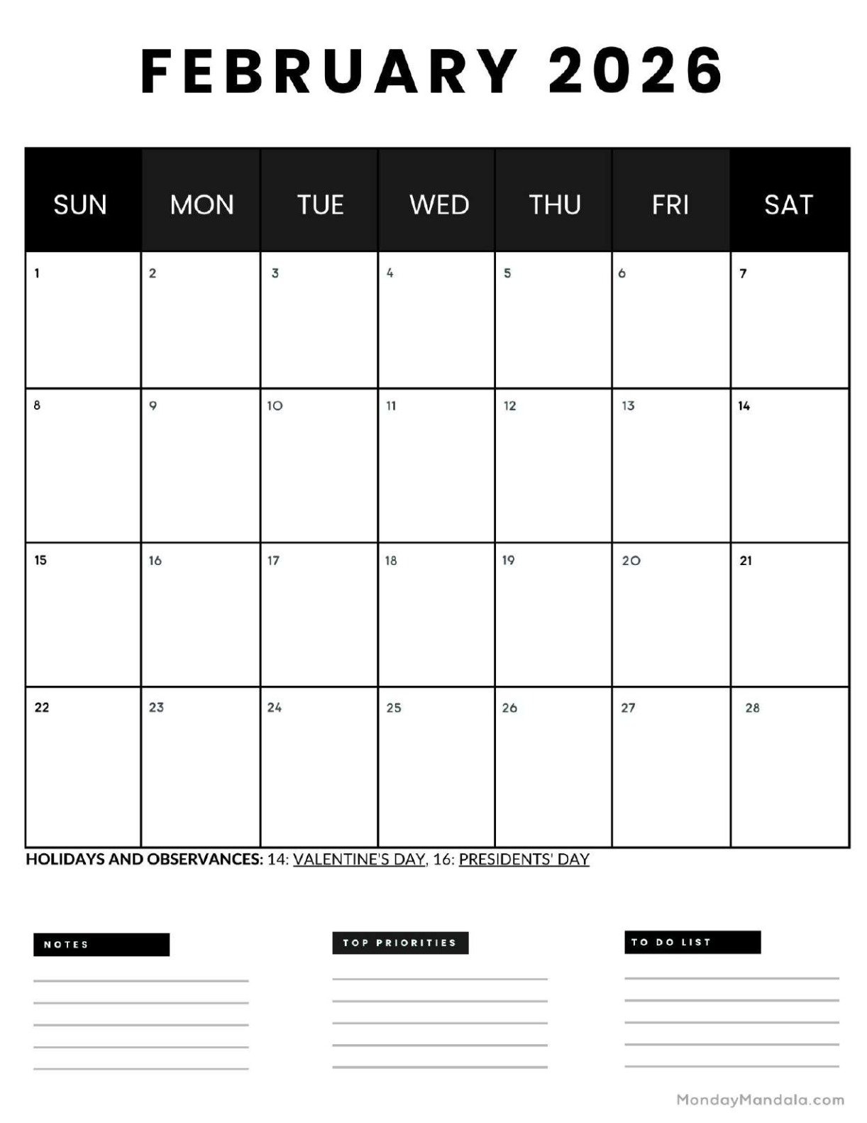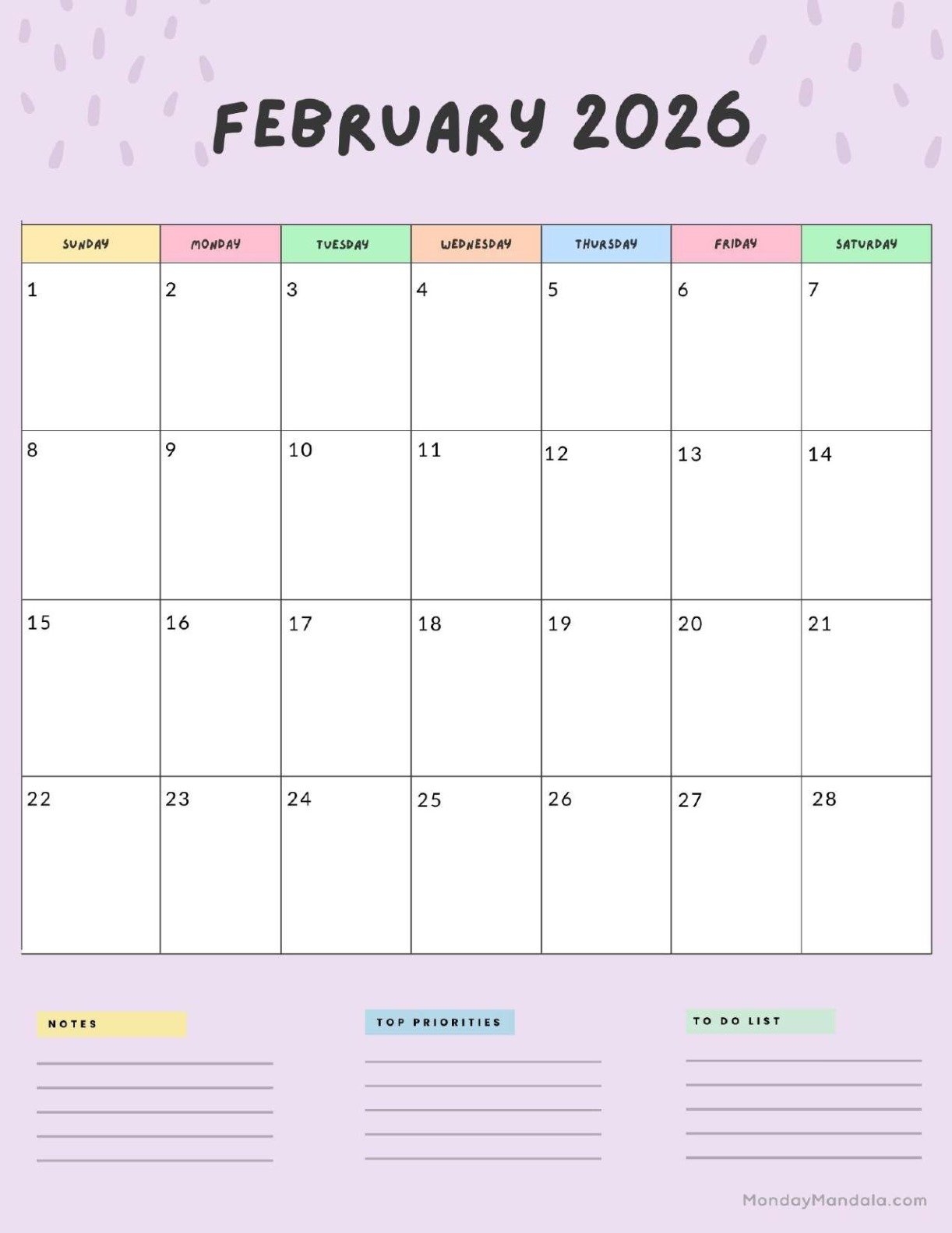 This calendar includes all the days of February 2026, making it easy for you to jot down your plans for the month. Whether you have birthdays, anniversaries, work meetings, or just want to schedule some me-time, our calendar has got you covered.