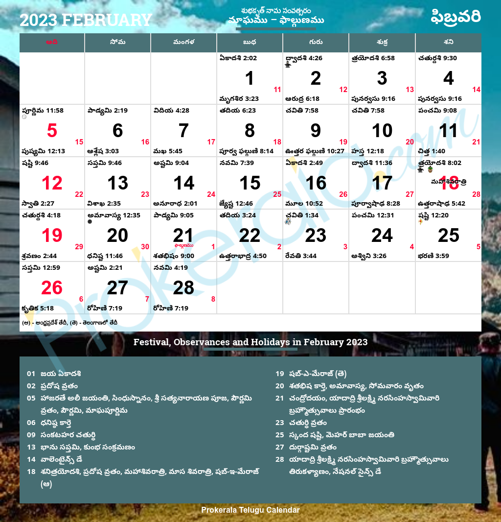 February in the Telugu calendar is known for the festival of Maha Shivaratri, a day dedicated to Lord Shiva. It is celebrated with fasting, prayers, and offering special rituals to the deity.