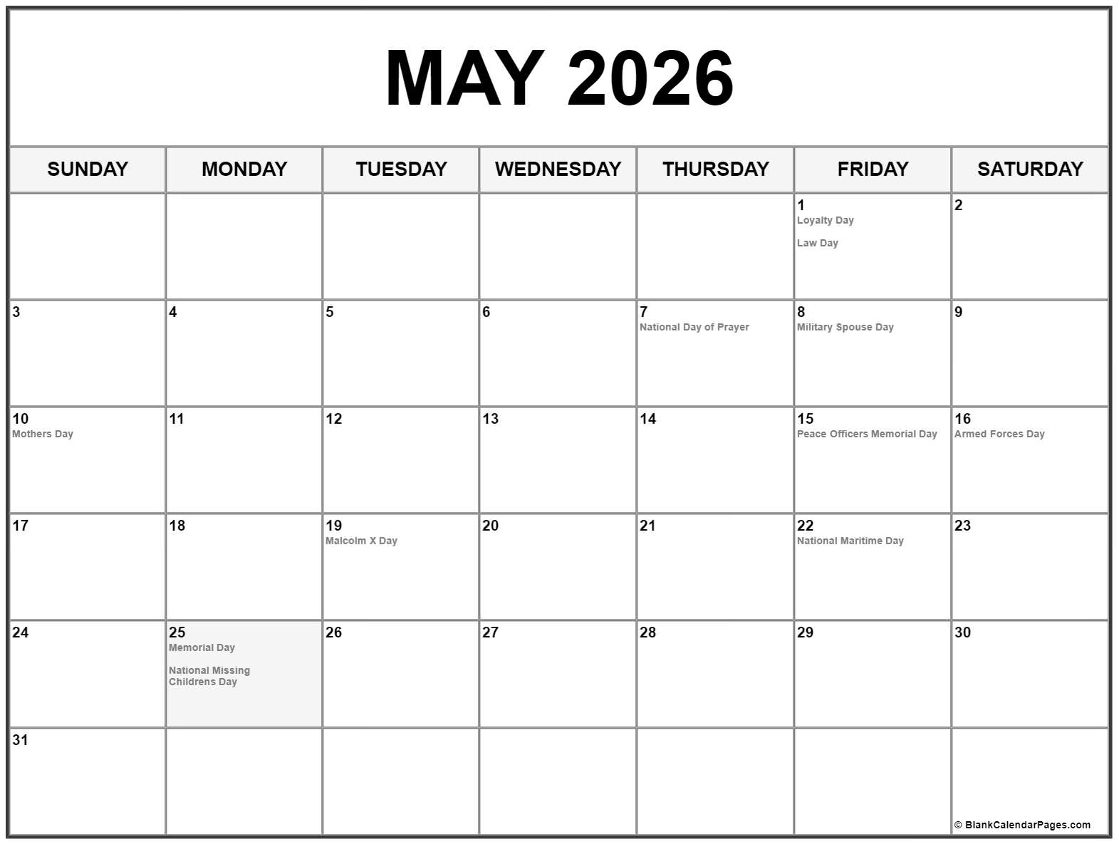 May 2026 Calendar Holidays