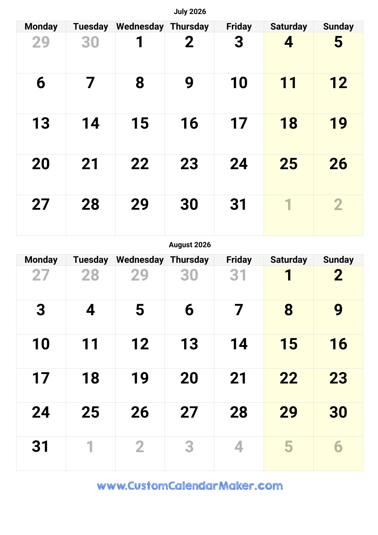 July And August 2026 Calendar Printable PDF 2 Month Calendar Template