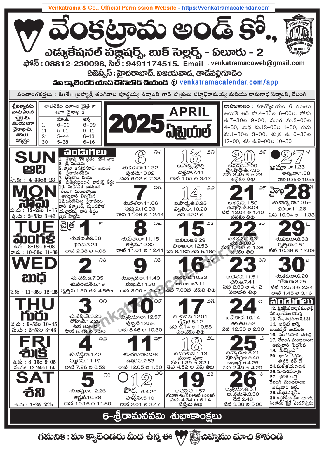 Venkatrama Telugu Calendar 2025 April Venkatrama Telugu Calendar 2025 Festivals Rasi Phalalu 2025 2026 Muhurtham